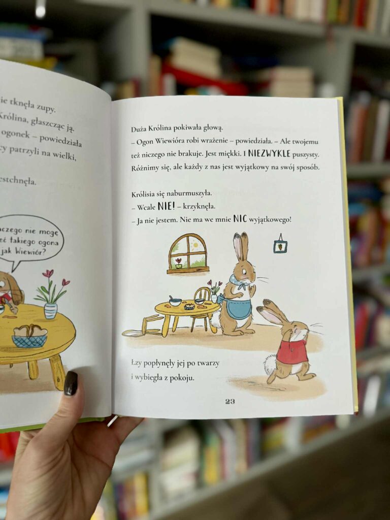 Jedną z historii, która szczególnie zapadła mi w pamięć, jest ta o Królisi i jej marzeniu o długiej, puszystej kicie, dokładnie takiej jak u wiewiórki. Królisia ma oczywiście swój piękny króliczy ogonek, ale wcale jej to nie pociesza. I wtedy pojawia się mama, pokazując jej spokojnie, że różnorodność jest czymś dobrym, że każdy ma swoje atuty. Następnego dnia Królisia biegnie w wyścigu i okazuje się najszybsza. Zaczyna zauważać, że każdy jest inny, ma inne umiejętności, inaczej wygląda, co innego lubi. Gdyby wszyscy wyglądali i zachowywali się tak samo, byłoby przecież okropnie nudno.