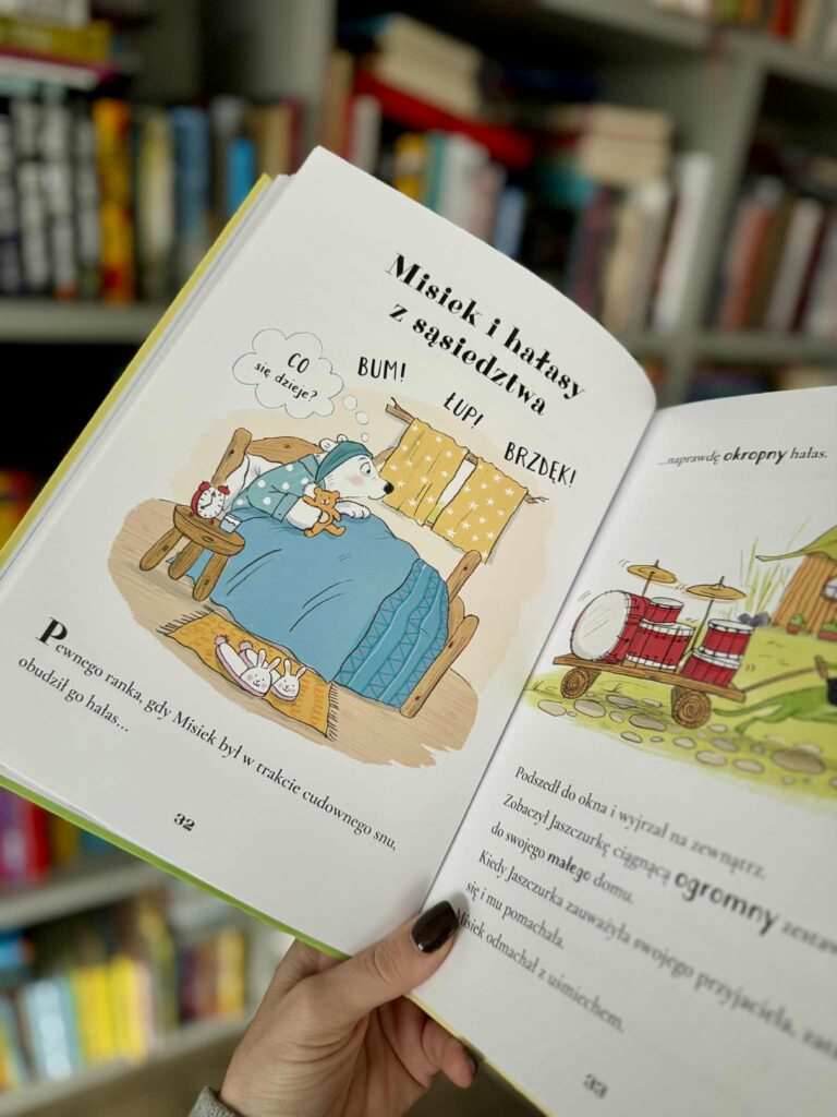 Jest też świetna opowieść o misiu, który mieszka obok jaszczurki zafascynowanej perkusją. Tyle że jaszczurka ćwiczy o poranku, a misio po prostu lubi się wtedy wyspać. I tu pojawia się temat, który dla wielu dzieci jest trudny: jak powiedzieć komuś, że coś nam przeszkadza, żeby go nie zranić? Wspaniała opowieść o szczerości, asertywności i dbaniu o swoje potrzeby bez krzywdzenia innych.