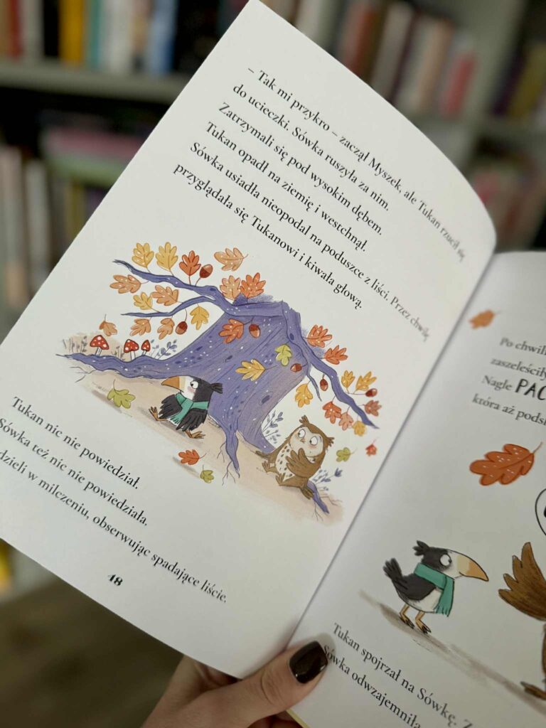 Bardzo poruszająca jest też opowieść o Borsuczce – mistrzyni zamartwiania się. Boi się występu, bo a nuż kichnie, a może się potknie, a może zapomni tekstu. To taka historia, która będzie bliska wielu dzieciom. Na szczęście Borsuczka ma obok mądrą Sowę i przyjaciół, którzy pokazują jej, że czarne scenariusze rzadko kiedy się sprawdzają, a o odwagę łatwiej, gdy ma się obok wspierających bliskich.