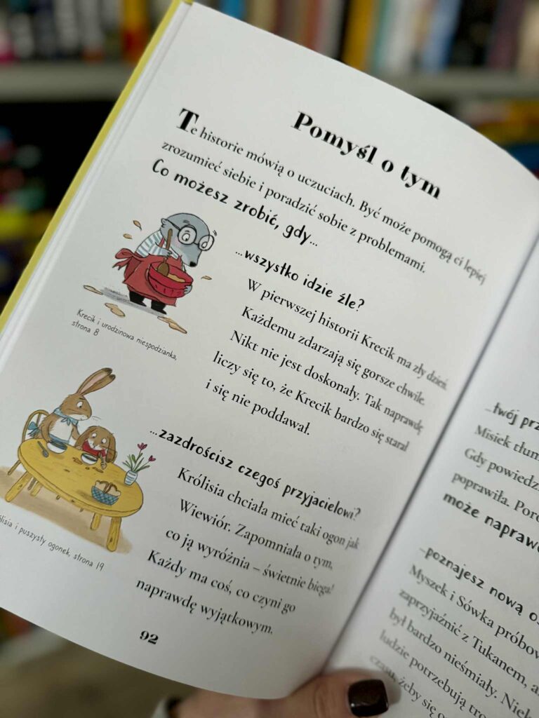 W tych opowiadaniach piękne jest także to, że nikt nie podaje dzieciom gotowych rozwiązań. Tu nie ma nachalnych morałów. Jest za to zmiana perspektywy, czasami nowy dzień, czasami drobna rozmowa – coś, co sprawia, że bohater patrzy na swoją sytuację inaczej. To też opowiadania o zagubionych czapeczkach, o niespodziankach urodzinowych, które nie wyszły, o balonach, które uciekły. Niby drobiazgi, a dla dziecka to przecież sprawy najważniejsze. I ta książka absolutnie tego nie bagatelizuje. Szanuje dziecięce emocje, pokazuje je z czułością i zrozumieniem, a jednocześnie daje poczucie bezpieczeństwa.
