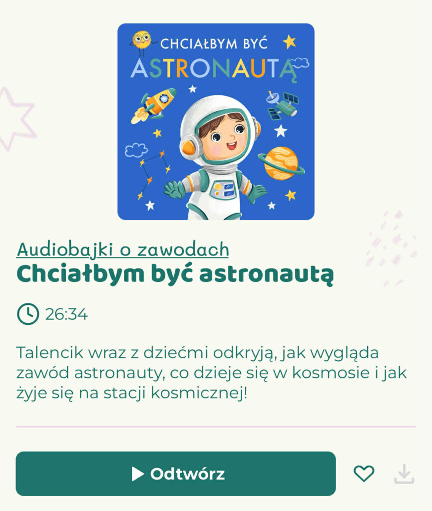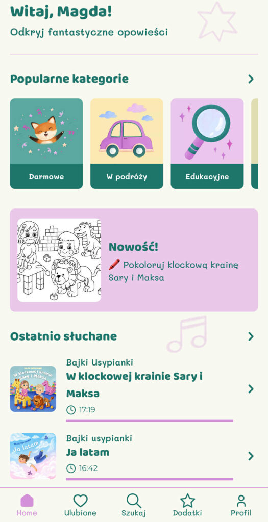 W aplikacji znajdziesz też darmowe bajki, a część z nich można posłuchać również na YouTubie. Można tworzyć własne playlisty, wracać do ulubionych historii i budować z nich rodzinne rytuały.