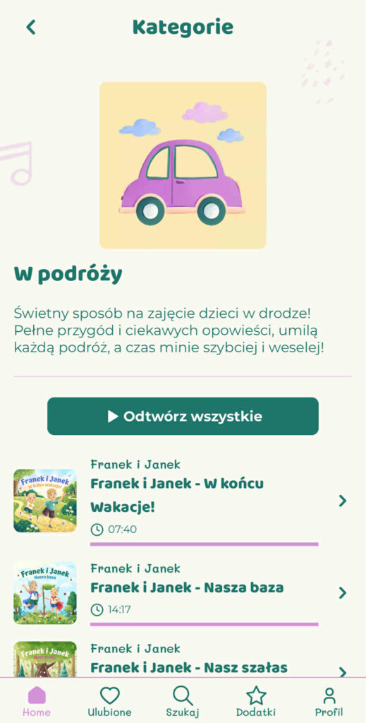 Bajkowe Poddasze to aplikacja przejrzysta, spokojna i pełna treści. Nie ma tu reklam, rozpraszaczy ani przypadkowych bodźców. Bajki są podzielone na kategorie, dzięki czemu łatwo znaleźć tę właściwą na każdą okazję: