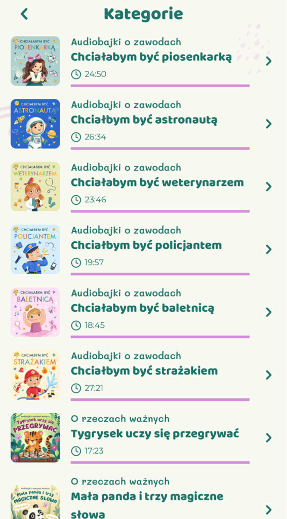 To świetne uzupełnienie słuchowisk. Dziecko może kolorować, śpiewać lub po prostu odpoczywać, słuchając historii. Długość bajek jest różna – od kilku minut po ponad godzinne opowieści – więc zawsze można dopasować coś do rytmu dnia.