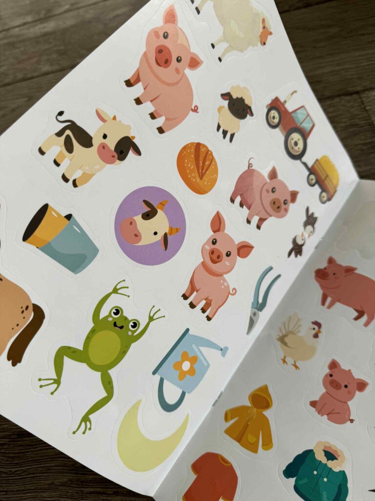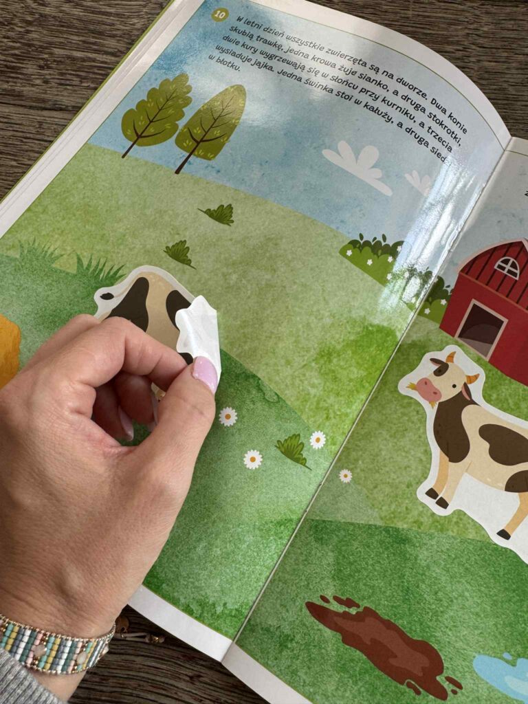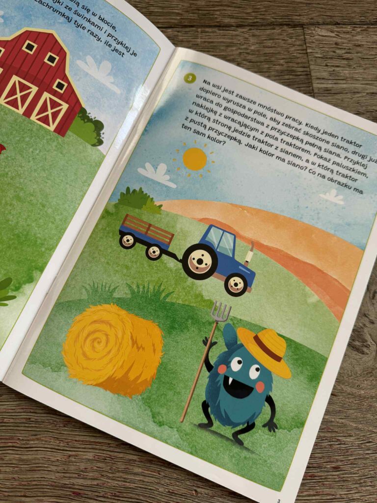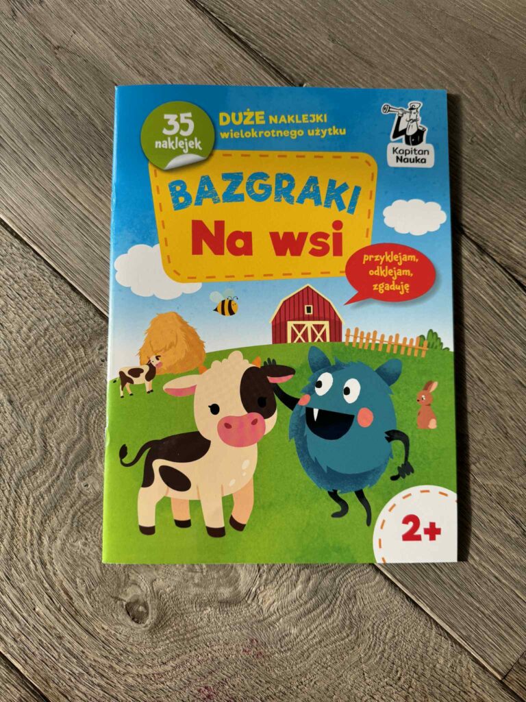 Zaczynamy od propozycji dla dwulatków, czyli „Bazgraki na wsi”. W tej książeczce są naklejki wielokrotnego użytku (aż 35!) i różnorodne zadania. Maluch szuka zwierząt, przykleja, wskazuje paluszkiem, bawi się w labirynty, a przy okazji ćwiczy koordynację ręka–oko i rozwija mowę. Dobrze wiem, ile radości sprawia zabawa w naśladowanie odgłosów czy ruchów konia, krowy czy świnki.