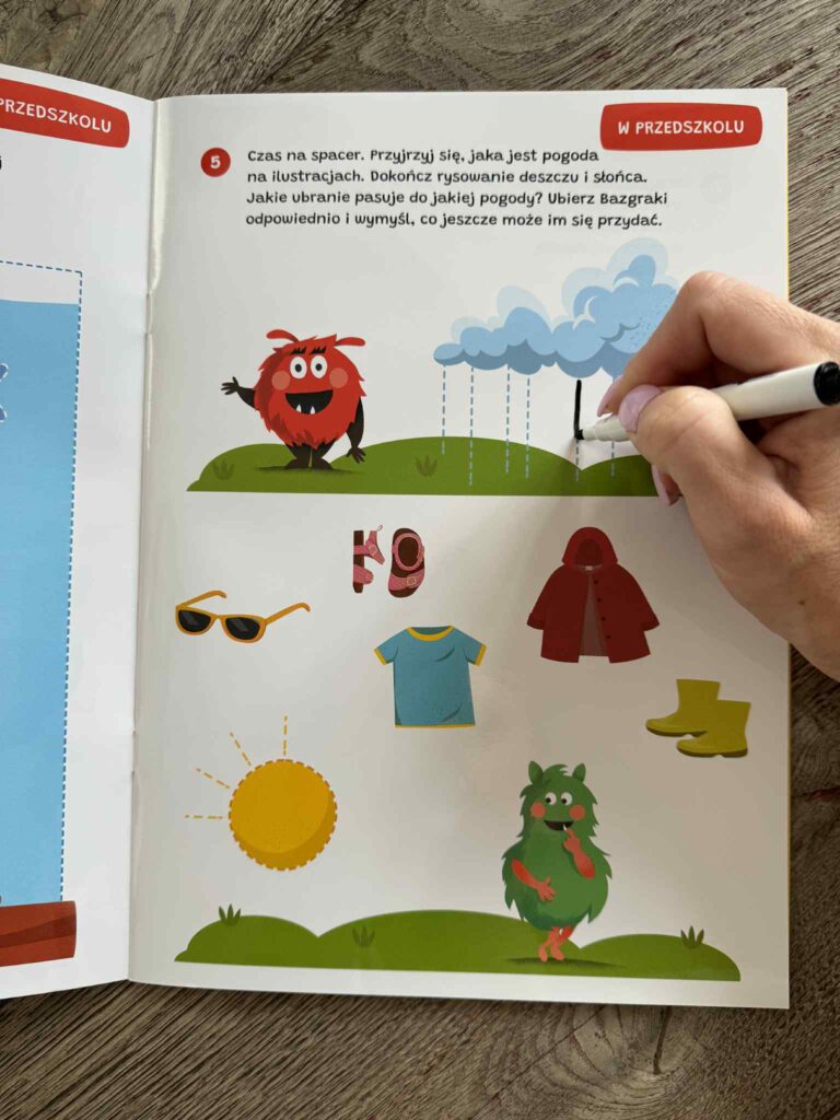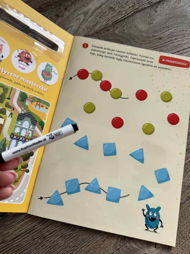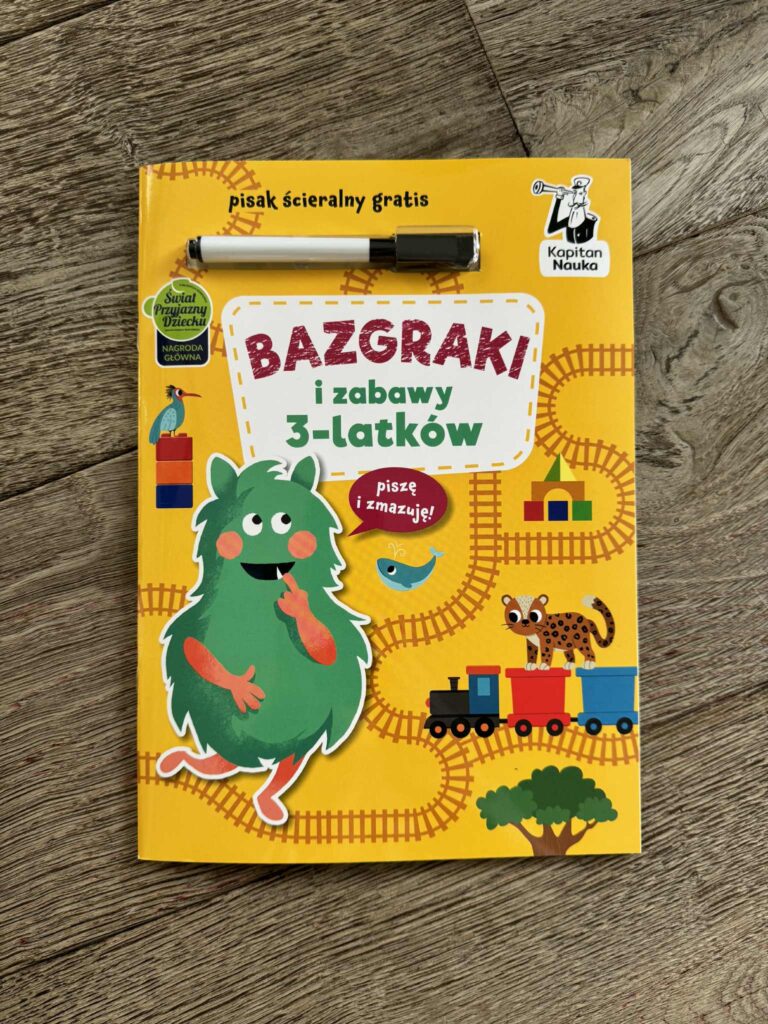 Kiedy dziecko kończy dwa lata, pojawia się naturalna chęć rysowania i bazgrania po wszystkim. I wtedy sprawdzi się zeszyt „Bazgraki i zabawy trzylatków. Piszę i zmazuję”. To jest cudowne, że dziecko może rysować szlaczki, prowadzić kredkę po śladzie, rozwiązywać labirynty – a potem wszystko zmazać i zacząć od nowa. Zero stresu, że coś wyjdzie źle.