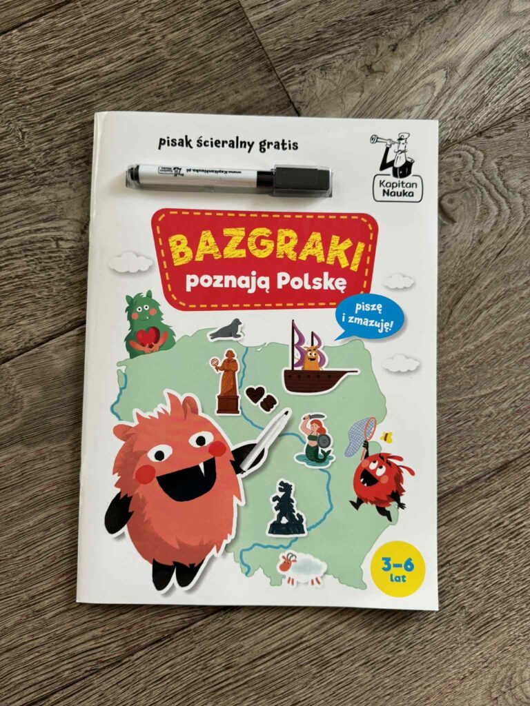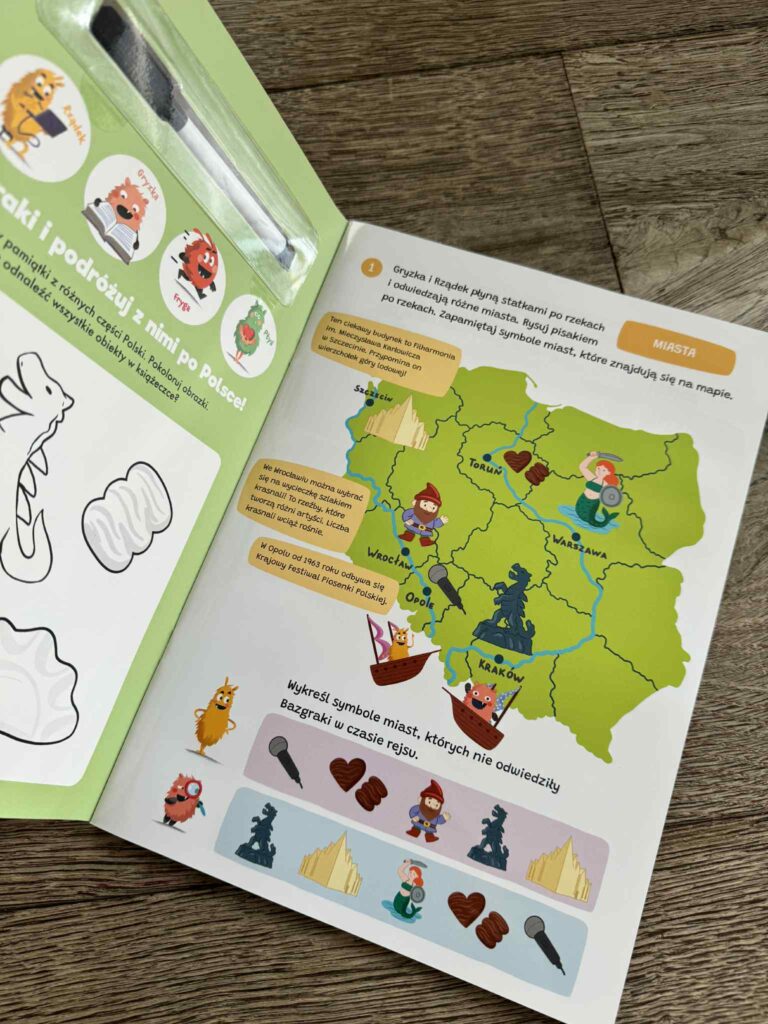 Dla starszych dzieci (3–6 lat) jest jeszcze ciekawsza propozycja – „Bazgraki poznają Polskę. Piszę i zmazuję”. To nie tylko zabawa, ale też pierwsze spotkanie z naszym krajem. Dzieci odwiedzą wiele regionów, poznają lokalne tradycje, a nawet legendy. I to wszystko w formie zabawy i bez nudnych faktów.