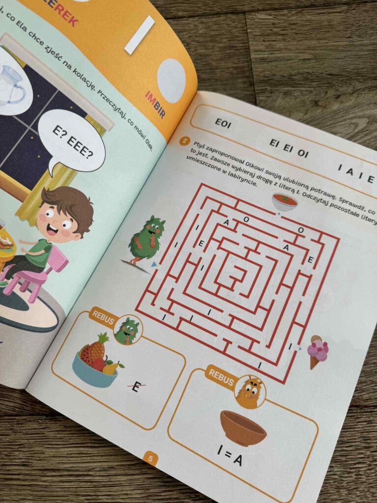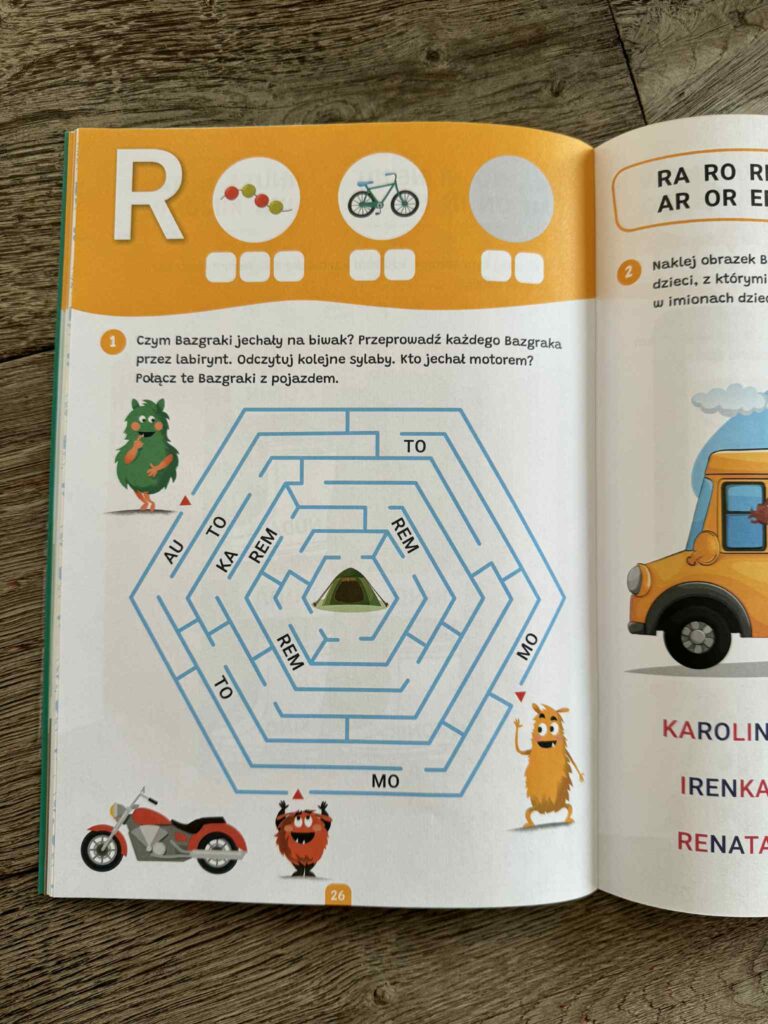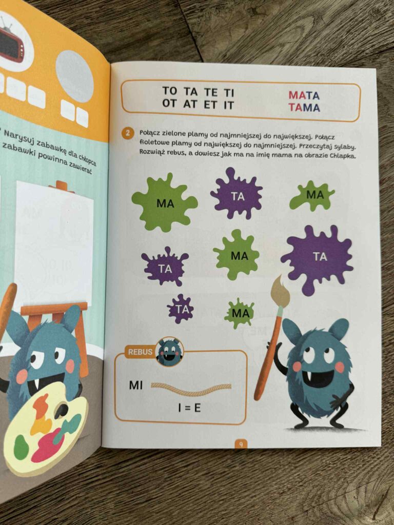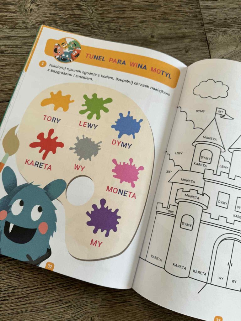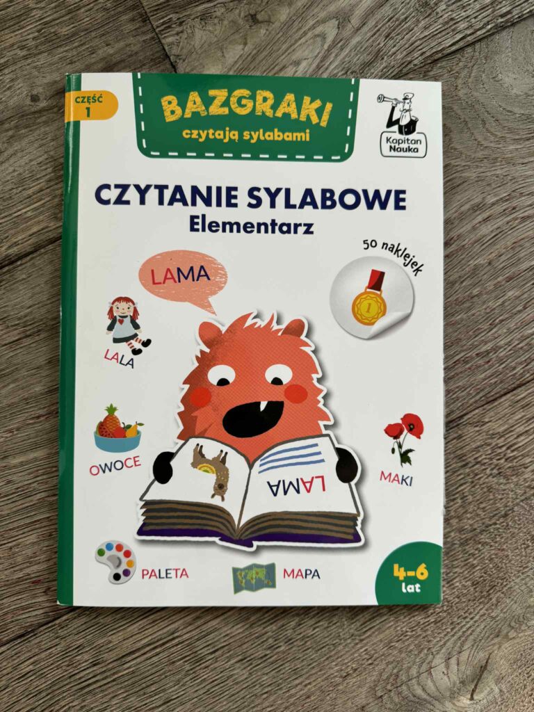 „Bazgraki czytają sylabami” to z kolei pierwszy krok w stronę samodzielnego czytania. Zamiast monotonnych ćwiczeń są tu komiksy, zagadki, rebusy i krótkie zadania podzielone na małe porcje wiedzy. Dziecko ćwiczy pamięć, koncentrację i spostrzegawczość wzrokową, a przy okazji naturalnie wchodzi w świat sylab.