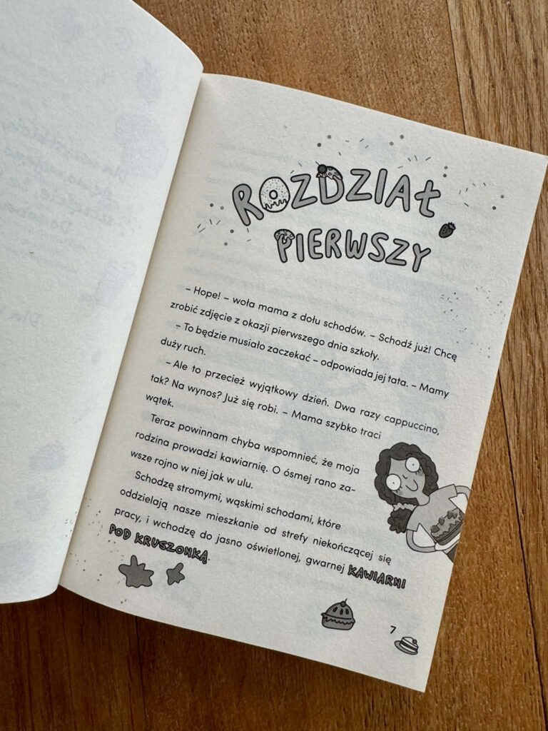 Poznajemy Hope, jedenastoletnią dziewczynkę, która mieszka… w kawiarni. A właściwie nad kawiarnią „Pod Kruszonką”, którą prowadzą jej rodzice. To nie jest jednak tylko tło wydarzeń, ale centrum życia całej rodziny. Kredyt, pomysły na promocję, nowe wypieki, zebrania kryzysowe – wszystko kręci się wokół tego miejsca. Hope nie stoi z boku. Ona w tym uczestniczy, podgląda, podpowiada, nasiąka tym światem jak biszkopt kawą.