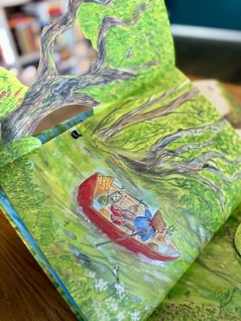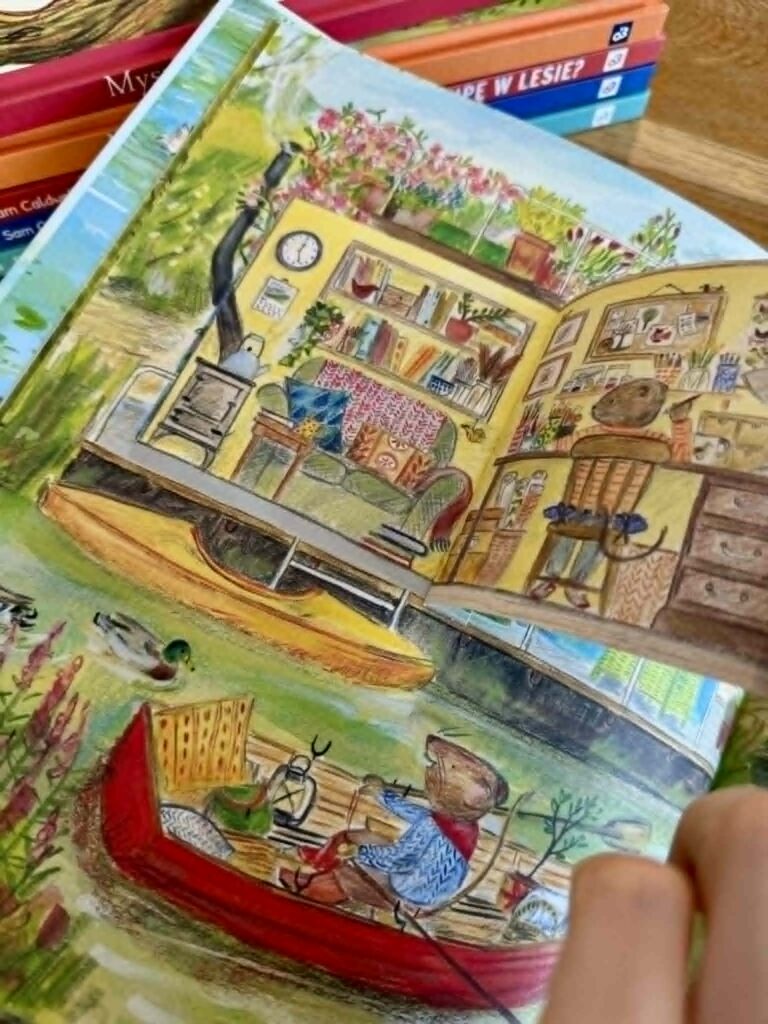 „Myszka nad rzeką” to spokojna podróż łódką przez miasto, las, łąki. To spotkania z innymi bohaterami i obserwacja zmieniającego się krajobrazu.