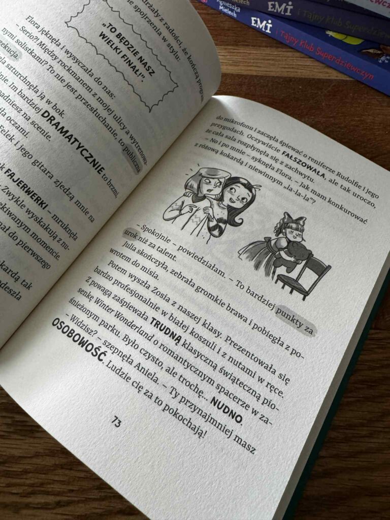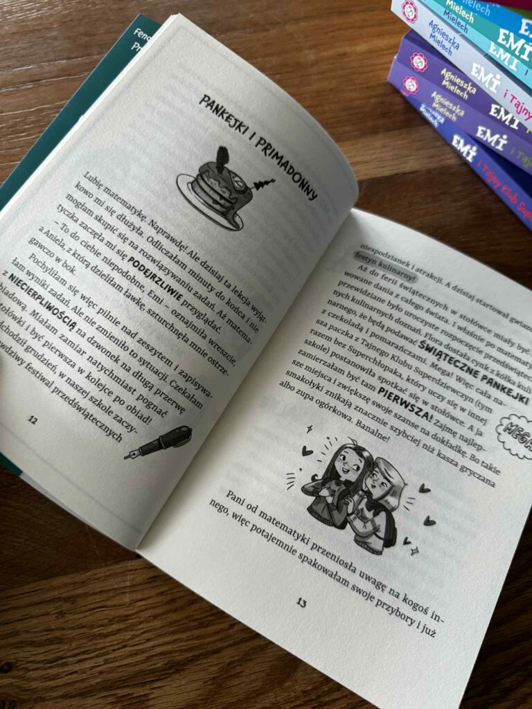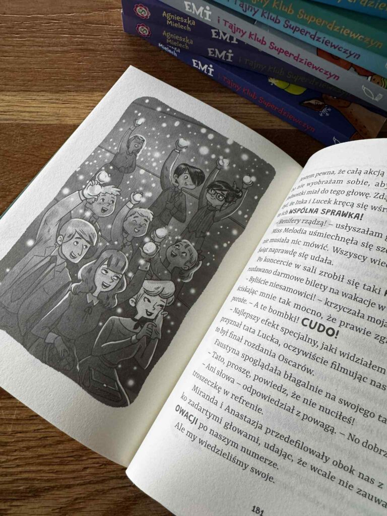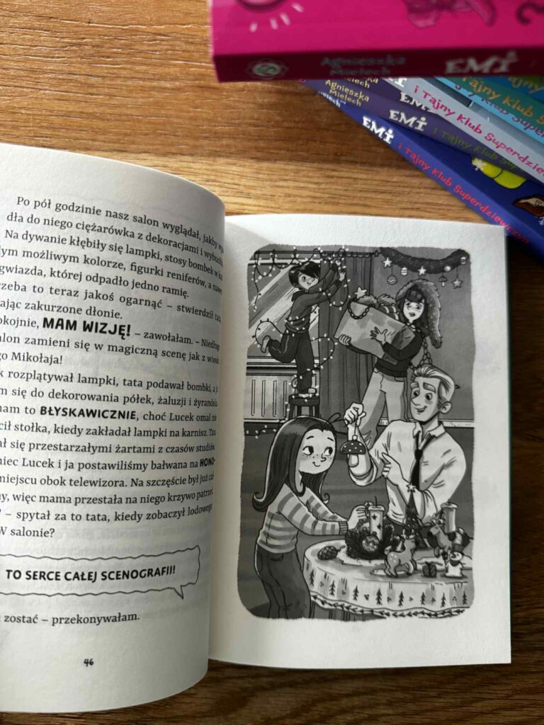 Czytając najnowszy tom „Emi i Tajny Klub Superdziewczyn” miałam wrażenie, że ta książka naprawdę otula jak miękki koc. Nie tylko dlatego, że dzieje się przed Bożym Narodzeniem, ale dlatego, że przypomina o tym, co w świętach (i w życiu) najważniejsze – o bliskości, zrozumieniu i o tym, że warto być dobrym człowiekiem.