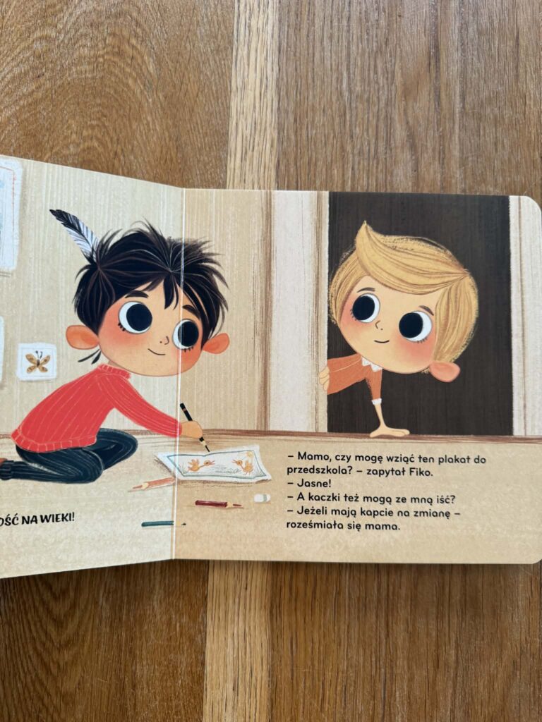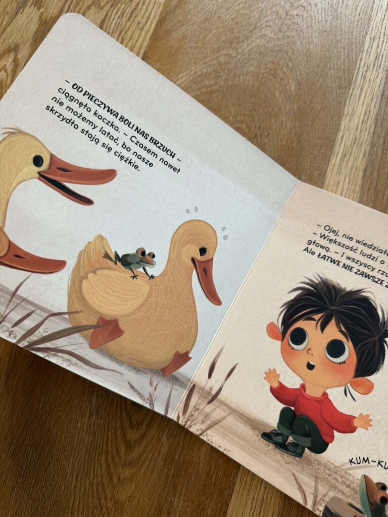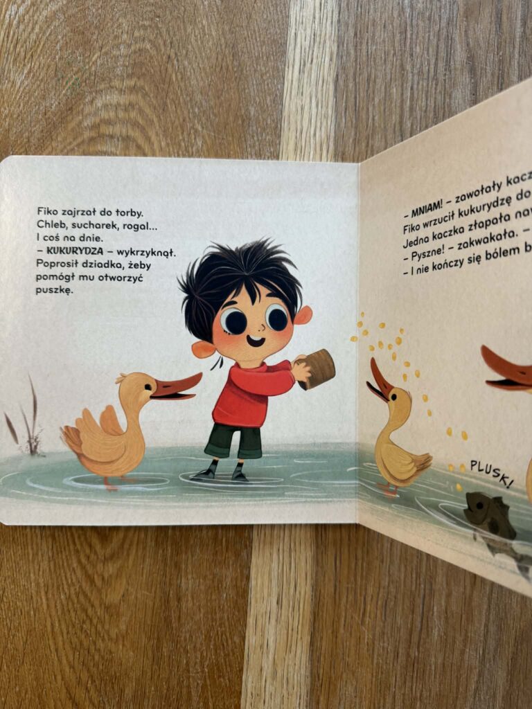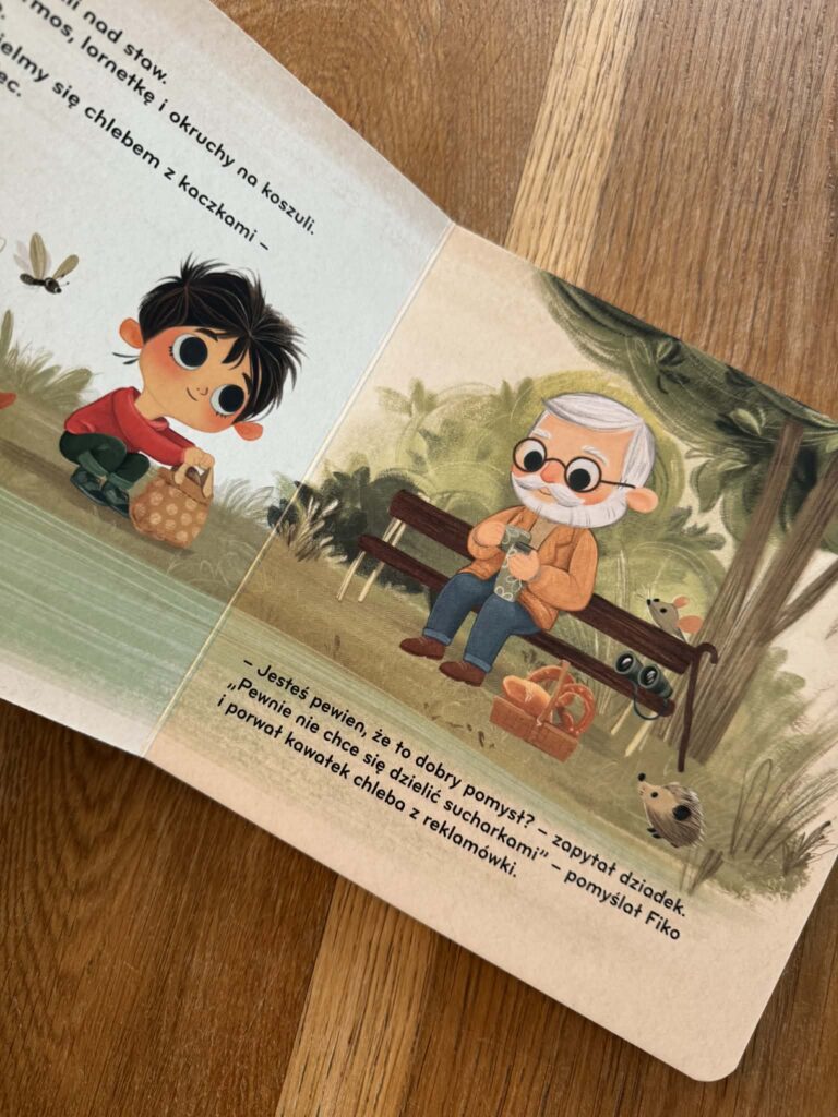 W ’Fiko i kaczki” chłopiec wybiera się z dziadkiem do parku i chce nakarmić kaczki bułką. I to jest właśnie ten moment, który zna każdy rodzic. Naturalny odruch, dobra intencja, ale niekoniecznie dobry pomysł. Książka pokazuje to bardzo spokojnie, bez zawstydzania, bez „nie wolno”, tylko tłumaczy, co jest lepsze dla zwierząt i dlaczego.