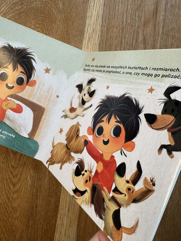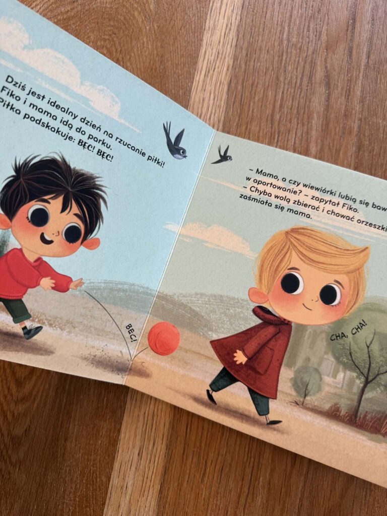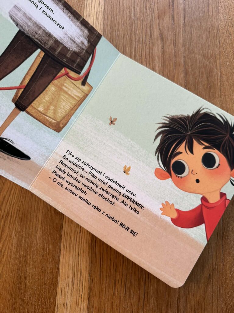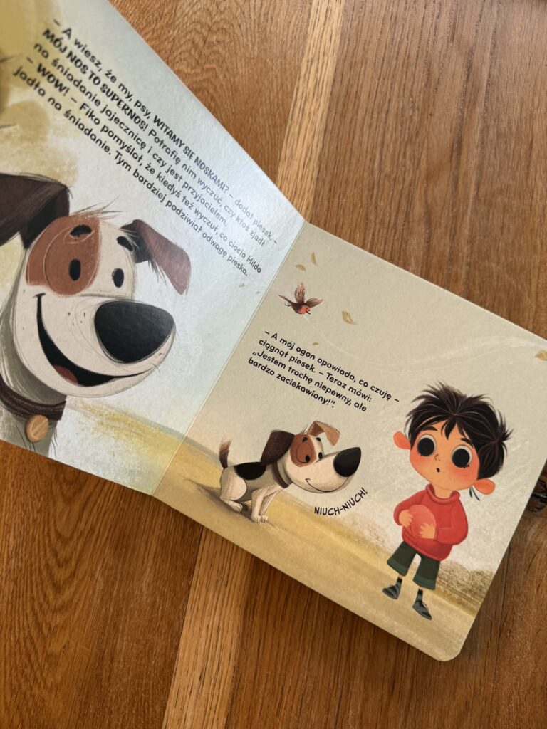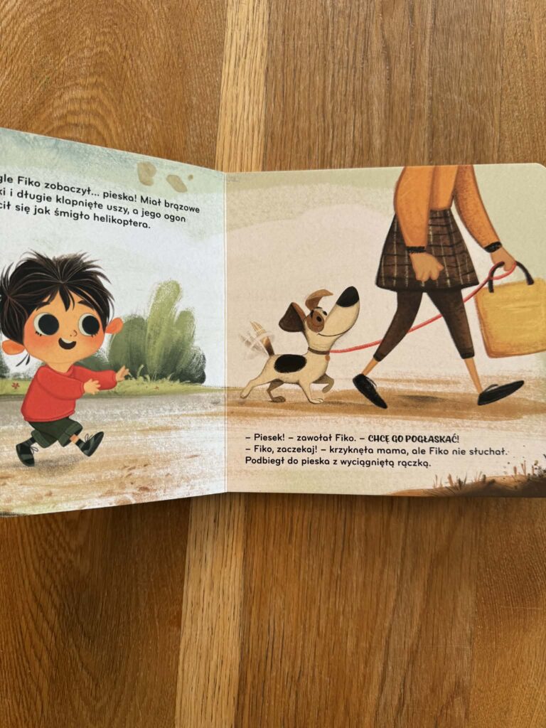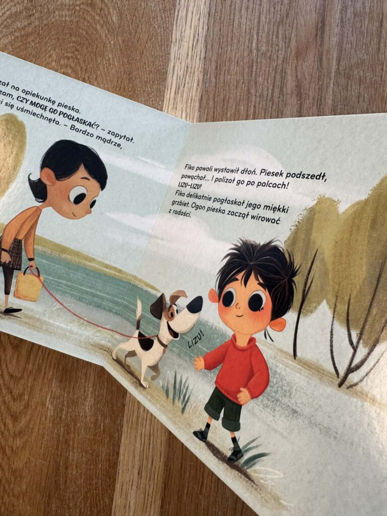 Z kolei w „Fiko i piesek” pojawia się sytuacja, którą też dobrze znamy. Dziecko widzi psa i od razu chce go pogłaskać. A pies przecież może się bać i zareagować w nieprzewidywalny sposób. I nagle dostajemy piękną, prostą lekcję uważności: jak podejść, jak poczekać, jak uszanować zwierzę.