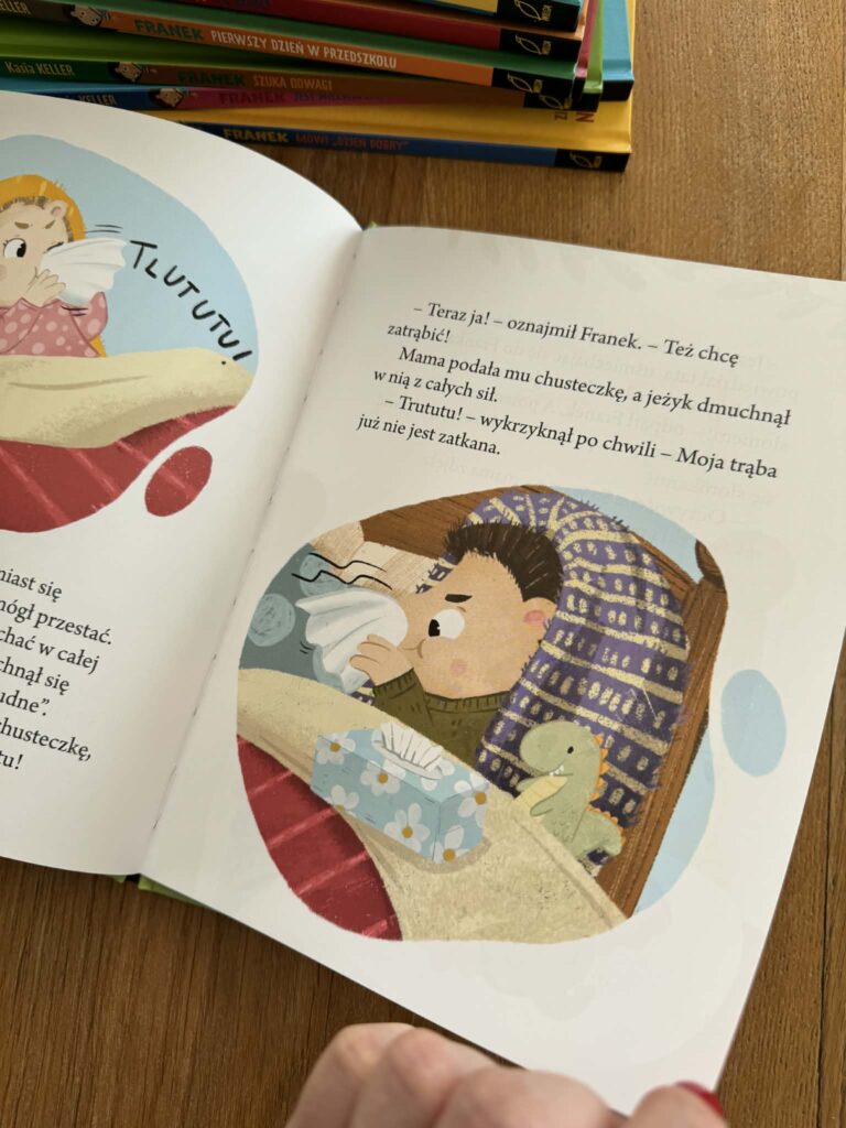 To już jedenaście krótkich historii, które trafiają dokładnie tam, gdzie trzeba, w codzienność dziecka. Sprzątanie zabawek, trudne przyjaźnie, emocje, pierwsze wyjścia, małe wielkie wyzwania. A teraz dochodzi kolejny temat z gatunku „niby drobiazg, a potrafi urządzić mały domowy dramat ” – nauka dmuchania nosa.