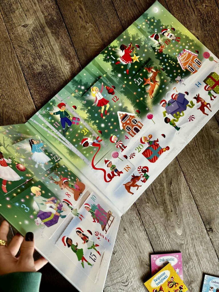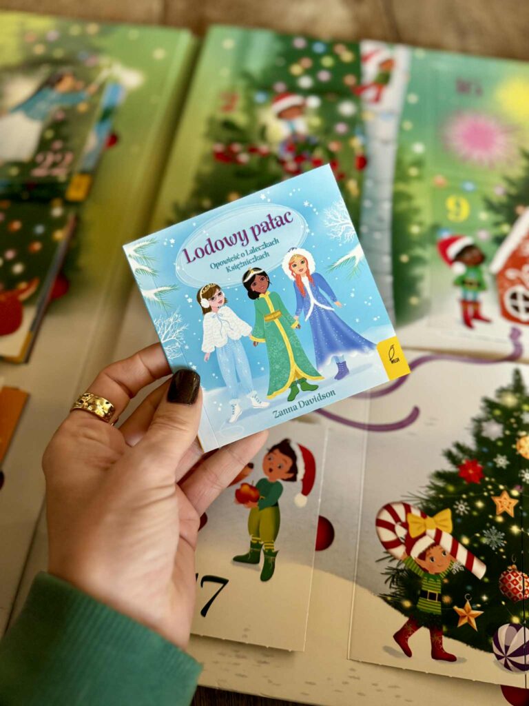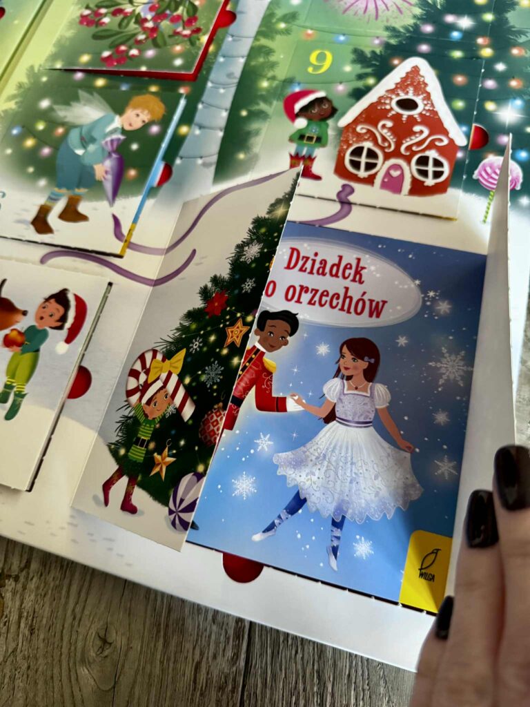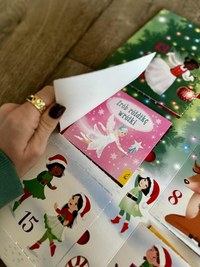 Mamy tu krótkie, magiczne opowiadania o księżniczkach, jednorożcach, koniach, o smokach i wróżkach. A w ostatnim, największym okienku czeka prawdziwa perełka – „Dziadek do orzechów” z naklejkami. Ale to jeszcze nie wszystko, bo te książeczki to nie tylko czytanie. W środku czekają też różne aktywności: łamigłówki, świąteczne labirynty, łączenie kropek, kolorowanki, szkicowniki, szukanie różnic… a nawet pomysł na to, jak zrobić własną świąteczną różdżkę! Naprawdę, tu się nie da nudzić. Każdego dnia coś nowego, a w tle niemal słyszysz jak dzwonią dzwoneczki.