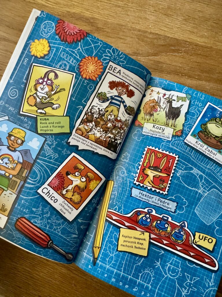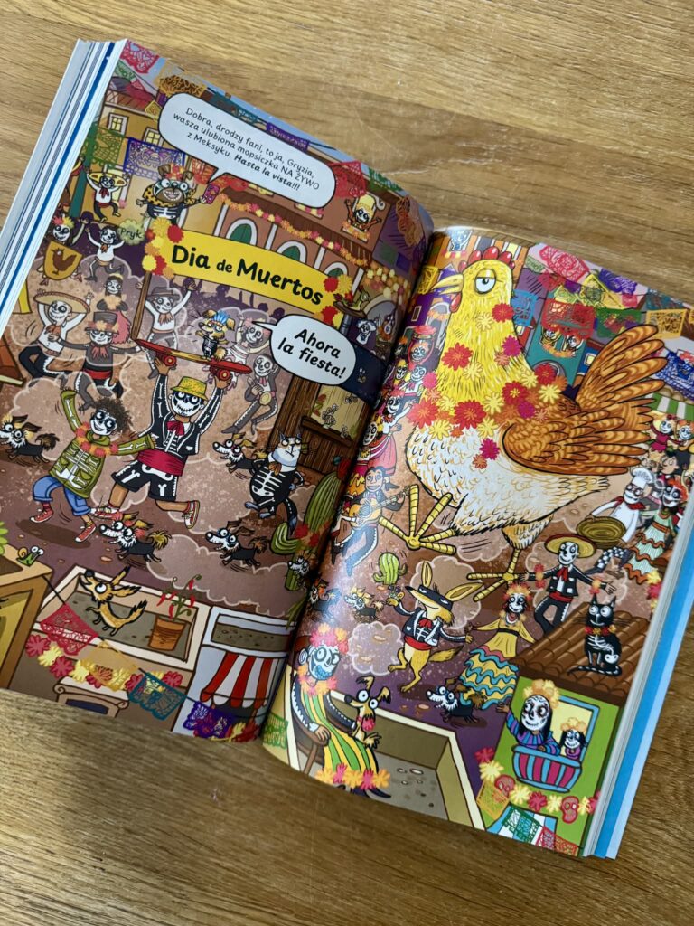 A skoro o kosmosie mowa, to w pierwszej historii znajdziemy się właśnie tam. UFO, porwanie, klonowanie i próba przejęcia władzy nad Ziemią, a wszystko to zaczyna się na wzgórzu z drzewem, na którym wiszą kalosze. Nie pytajcie. Tu logika robi sobie urlop. W drugiej części przenosimy się do Meksyku, świętujemy Día de los Muertos i bronimy miasta przed atakiem kaktusów zombie. Jest dynamicznie, kolorowo i z przemyconą porcją wiedzy o kulturze. Trzecia historia? Podwodna kraina w kałuży, potwory morskie, król Żabol i ucieczka, której kluczowym elementem okazują się bąki Gryzi. I to jest właśnie literatura skuteczna w rozśmieszaniu dzieci.
