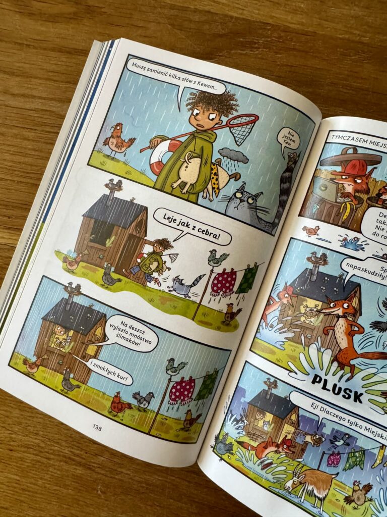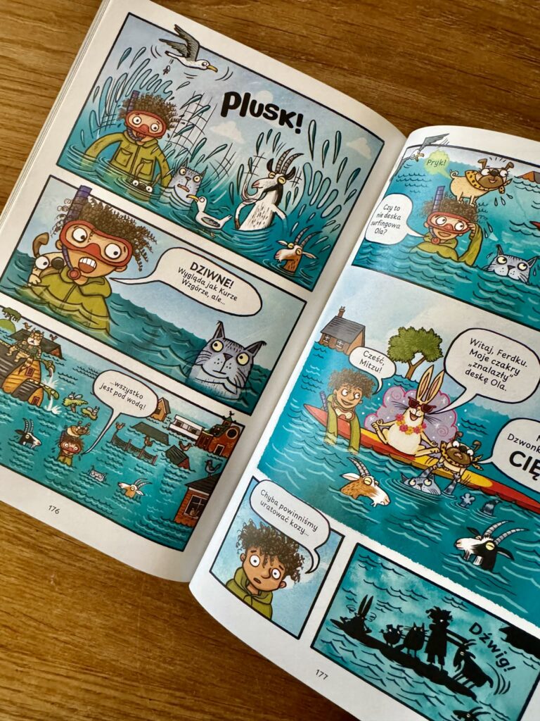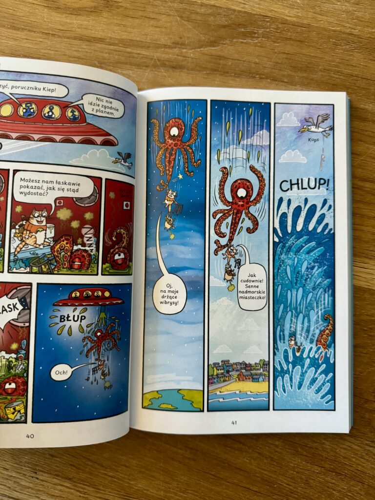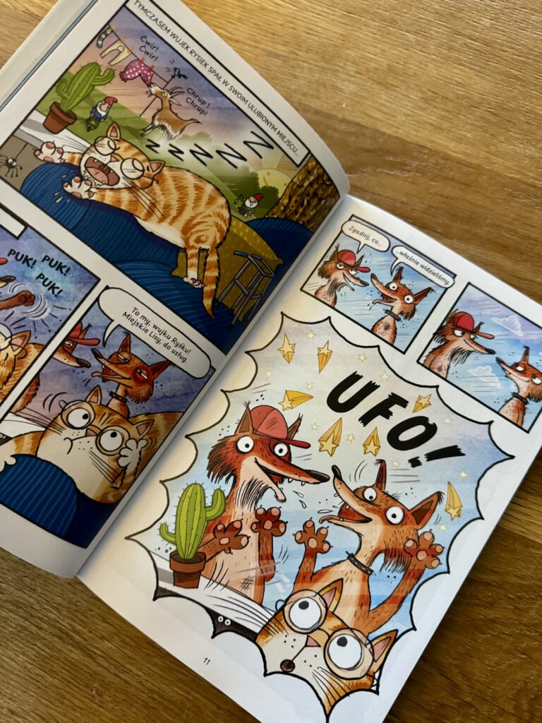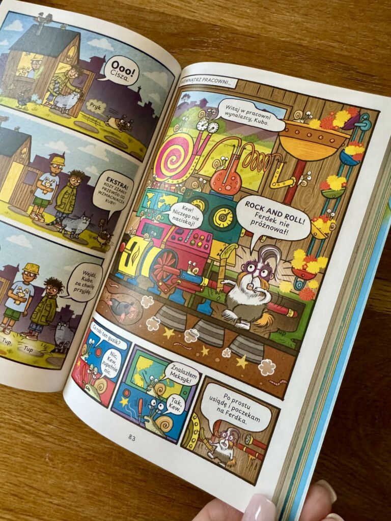 Piszę tę recenzję przede wszystkim dla rodziców, którzy szukają książek na czytelniczy start. Jeśli nie chcecie zrazić dziecka ścianami tekstu, jeśli marzy wam się radość, poczucie sukcesu i szybkie „przeczytałem całą książkę!” – komiksy są strzałem w dziesiątkę. Krótkie dialogi, dymki, tempo i obraz sprawiają, że dzieci czytają chętnie, a przy okazji ćwiczą koncentrację, logiczne myślenie i wyobraźnię, wypełniając to, co dzieje się między kadrami.