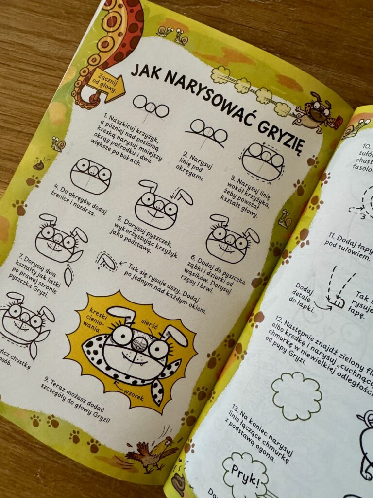 Autorka i ilustratorka Becky Blake zadbała o wszystko: tekst, tempo i stronę wizualną. Rysunki są kolorowe, dynamiczne, pełne absurdu i humoru bliskiego dzieciom (są bąki, wymioty, purchawki i kaktusy zombie – dokładnie to, co w pewnym wieku bawi najbardziej). Na końcu znajdziemy też instruktaż rysowania Gryzi, który działa jak zaproszenie: „hej, spróbuj sam”. I wiem, że to działa, bo Basia, zainspirowana komiksami, regularnie sięga po cienkopis i tworzy własne historie.