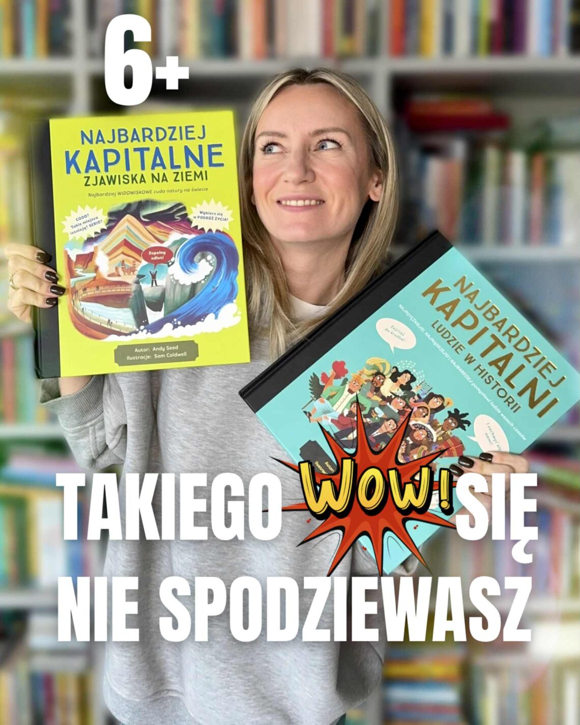 Takie książki popularnonaukowe dla dzieci lubię najbardziej: masa ciekawostek, zero nudy, dużo humoru i nietuzinkowe podejście do tematu. „Najbardziej kapitalne zjawiska na Ziemi” i „Najbardziej kapitalni ludzie w historii” to tytuły, których się nie spodziewasz. Zaskoczyły mnie doborem tematów i sposobem, w jaki je prezentują. Przed Tobą książki naprawdę kapitalne, takie, które uczą mimochodem i przy okazji świetnie bawią.