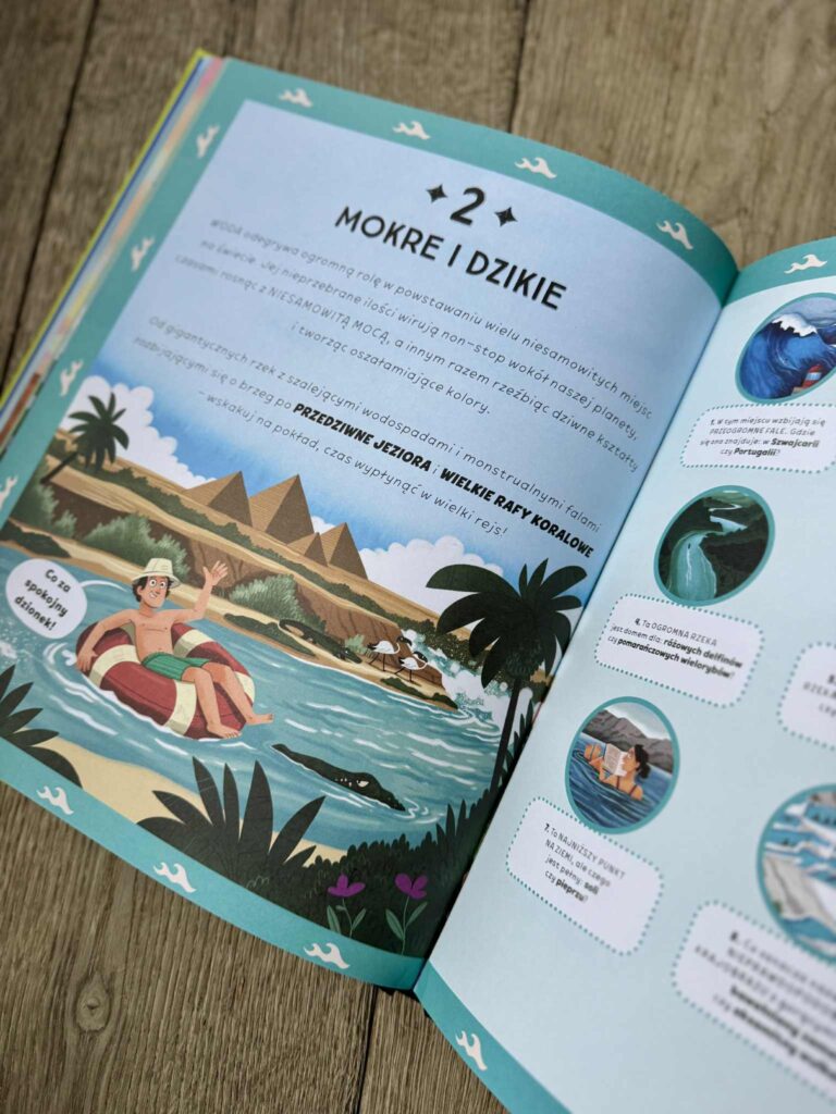 Każdy dział ma swoje Top 5, a wulkany, rzeki czy wyspy rywalizują o tytuł najbardziej wybuchowych, największych czy najgroźniejszych. To właśnie te smaczki — rankingi, porównania i ciekawostki — przykuwają uwagę i rozpalają wyobraźnię. A gdy dorzuci się do tego zabawne ilustracje oraz żartobliwe dymki i komentarze, dostajemy książkę po prostu… kapitalną!