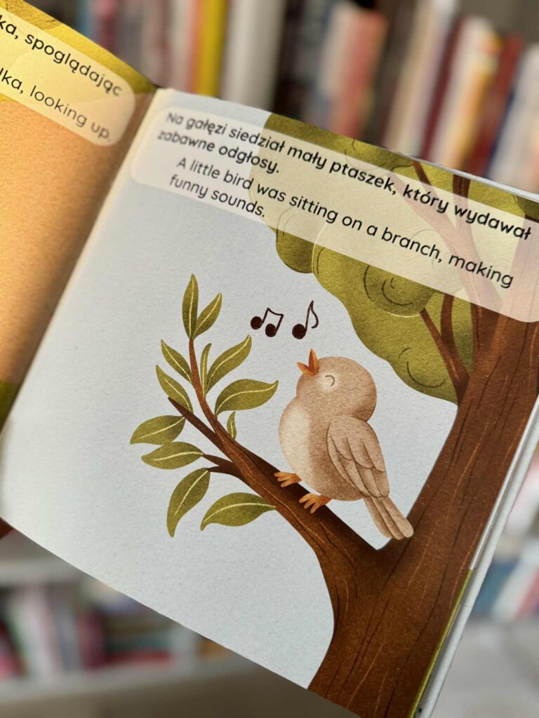 Tym, co wyróżnia tę książkę, jest jej dwujęzyczność. Każde zdanie zostało przetłumaczone na język angielski, ale nie w formie pojedynczych słów, a pełnych wyrażeń i zdań. To bardzo naturalny sposób oswajania dziecka z językiem: bez presji, bez nauki, a bardziej przez wspólne czytanie, słuchanie i powtarzanie.