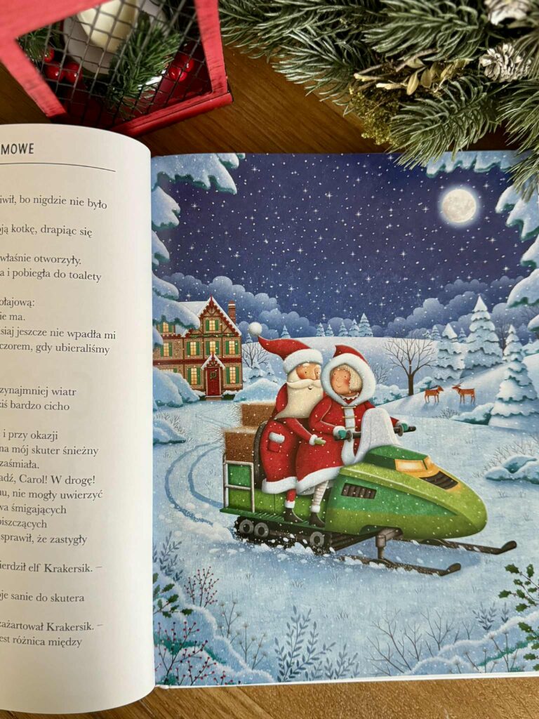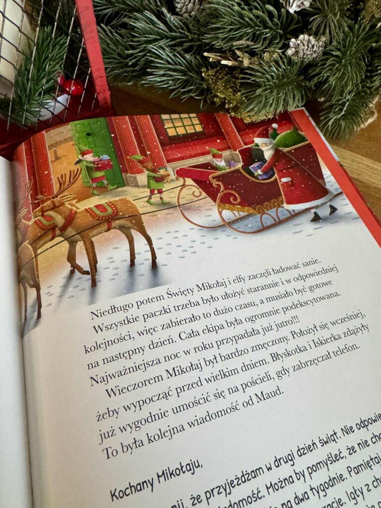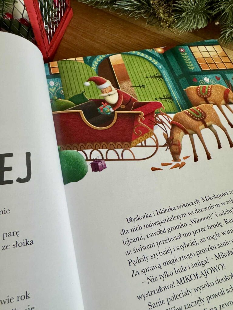 Mikołaj co chwilę zdradza nam swoje tajemnice i nagle dowiadujemy się, jak działa fabryka elfów, dlaczego renifery potrafią latać, po co Mikołajowi mięta i czy to możliwe, że pewnej nocy to pani Mikołajowa rozdawała prezenty. Tak, jest też kotka Błyskotka i pies Iskierka, bo przecież czemu święty Mikołaj miałby nie mieć swoich pupili.