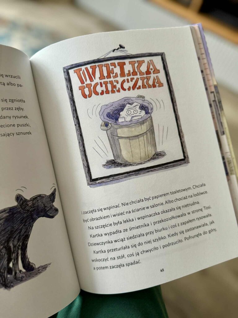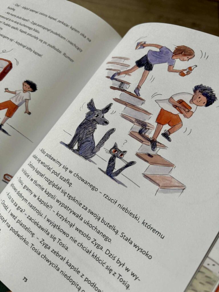 Ta książka wyraźnie porusza temat idei zero waste, ale robi to w sposób lekki, zabawny i bardzo przystępny dla dzieci. Bez moralizowania, za to z dużą dawką humoru i puszczaniem oka także do dorosłych. Pusty słoik może stać się lampą, karton – łodzią, a ograniczeniem okazuje się wyłącznie nasza wyobraźnia.
