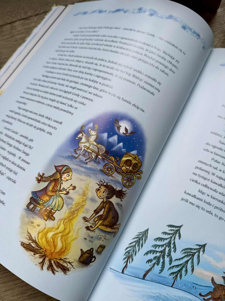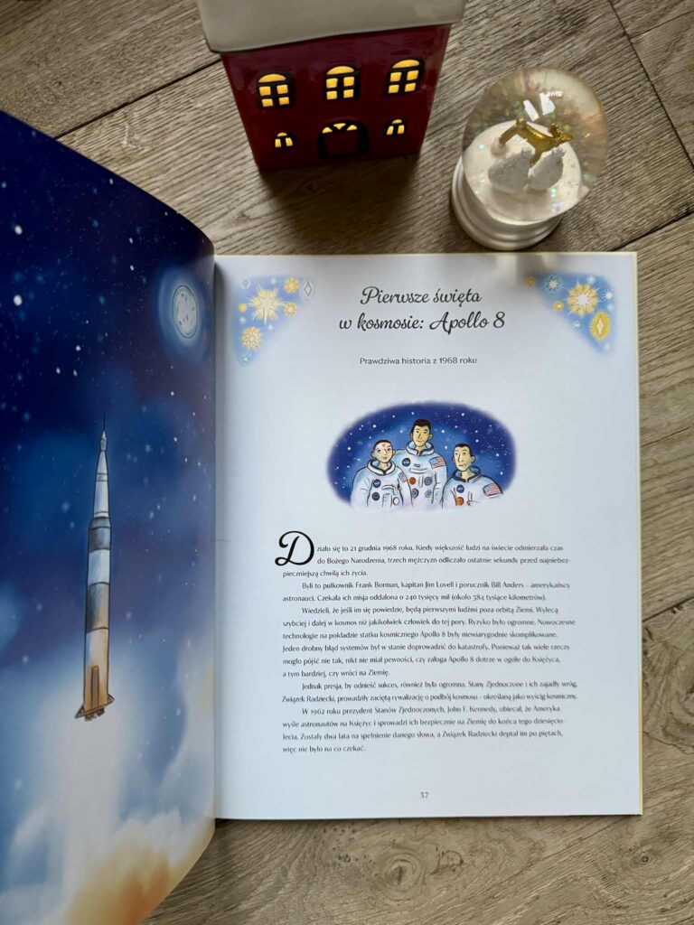 Na jednej stronie niemiecka piosenka „Choinko ma”, na drugiej – duńska baśń „Leśna czarownica”. Jest klasyka braci Grimm: „Elfy i szewc”, jest baśń bułgarska „Dziewczynka i śnieżna zawieja”. A pomiędzy nimi historie, które naprawdę się wydarzyły: lot Apollo 8 w 1968 roku i pierwsze święta w kosmosie , brytyjscy badacze na Antarktydzie w 1902 roku czy poruszający „Bożonarodzeniowy rozejm” z I wojny światowej.