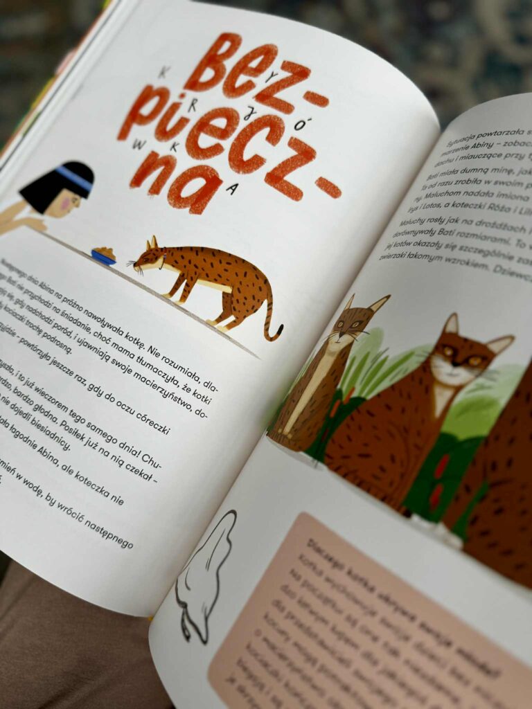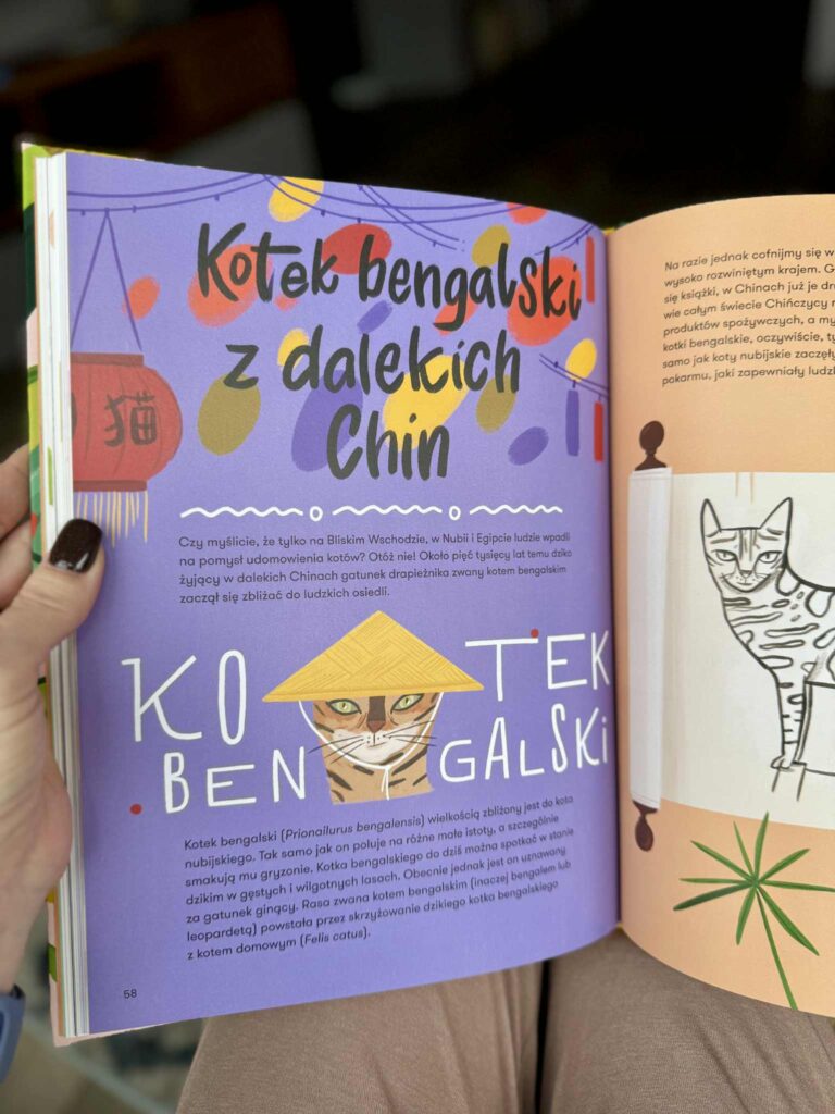 To nie jest zwykła książka popularnonaukowa pełna faktów i dat. To opowieść z bohaterami, emocjami i fabułą. Autorka zabiera nas do starożytnej Nubii, gdzie wszystko się zaczęło i do Egiptu, gdzie koty były czczone, gdzie bóstwa miały kocie oblicza, a utrata kota była niemal jak utrata członka rodziny. Zajrzymy też do dalekich Chin, gdzie dzikie koty bengalskie zaczęły powoli zbliżać się do ludzi. I dalej – do Europy, aż po Irlandię IV wieku, kiedy to pojawiają się pierwsze opowieści o tajemniczych „kotach morskich”, pożerających żeglarzy. Oczywiście będzie też kilka słów o współczesnych domach, w których razem z ludźmi żyją koty.