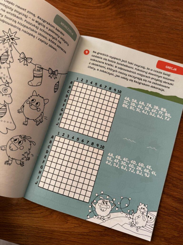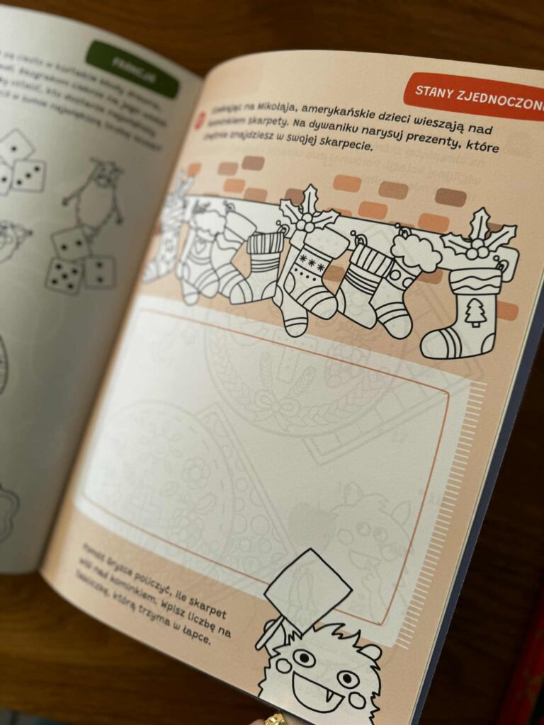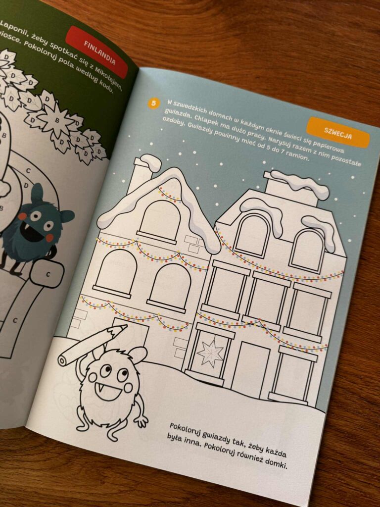 To jest złoto dla dzieci 3–6. Są tu 24 zadania, każde na jeden dzień grudnia, czyli taki bazgrakowy kalendarz adwentowy w wersji kreatywnej. Są naklejki, jest sporo różnorodnych aktywności (rebusy, labirynty, kolorowanki, algorytmy, kody) i naprawdę można to robić codziennie, małymi porcjami.