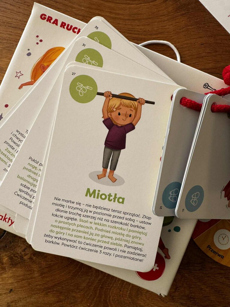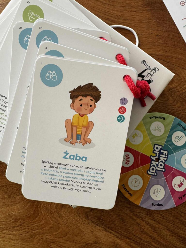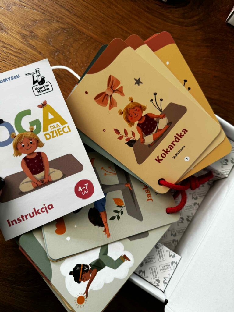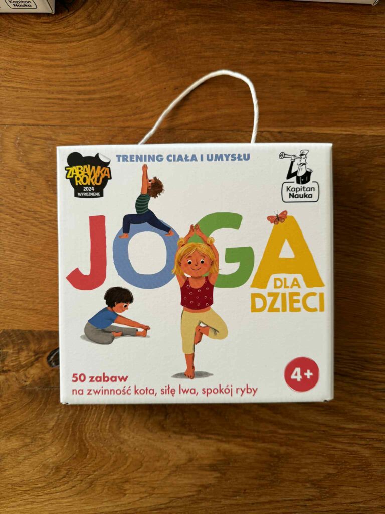 To może być kapitalne uzupełnienie poprzedniej gry. Mamy tu 50 kart z pozycjami jogowymi, które dzieci mogą odtworzyć, naśladować, łączyć w sekwencje. To jest zabawa, ale też budowanie elastyczności, spokoju, równowagi i świadomego „ugruntowania”. Działa na ciało, działa na emocje, a w dzisiejszych czasach to ogromny plus.