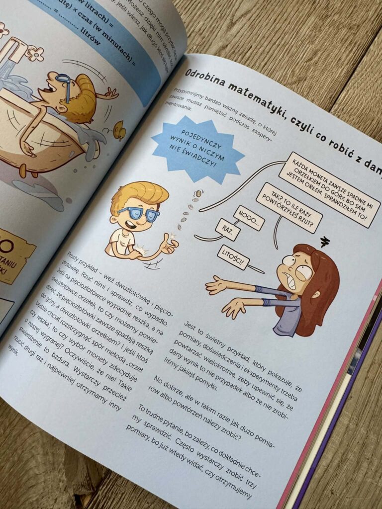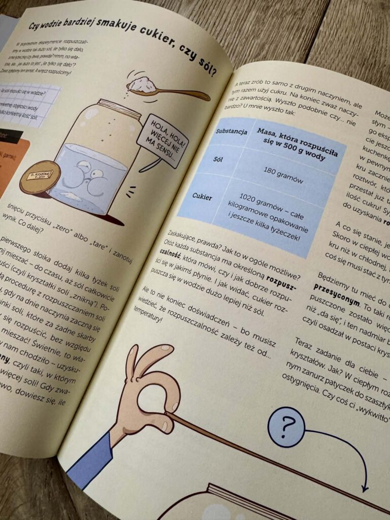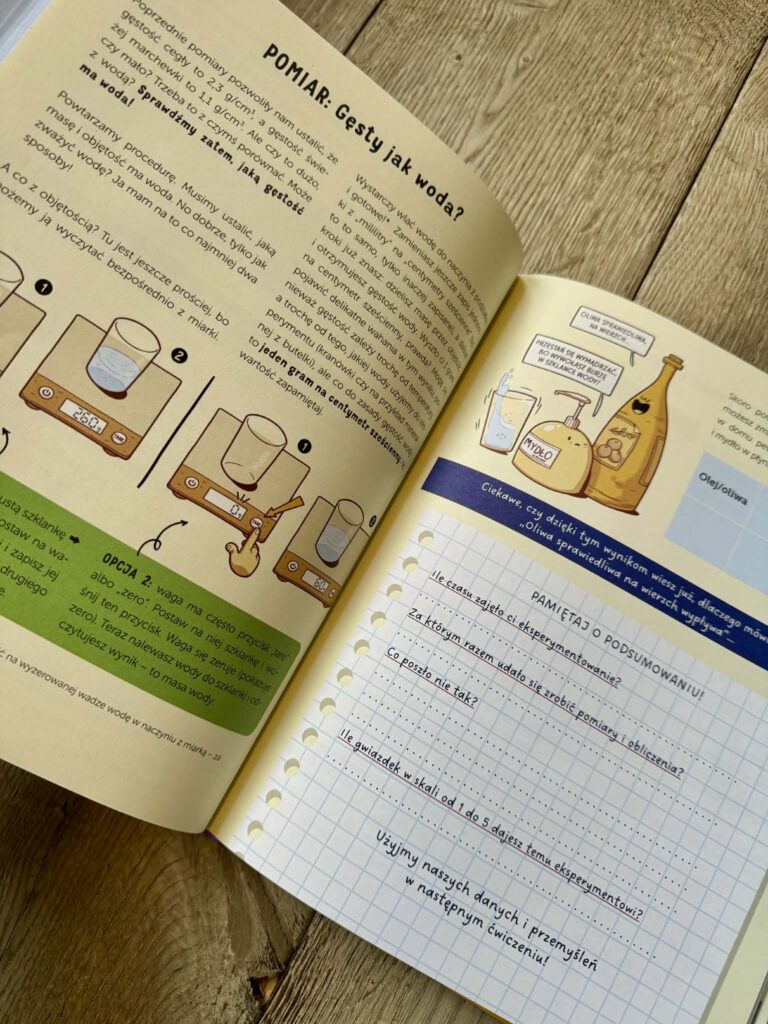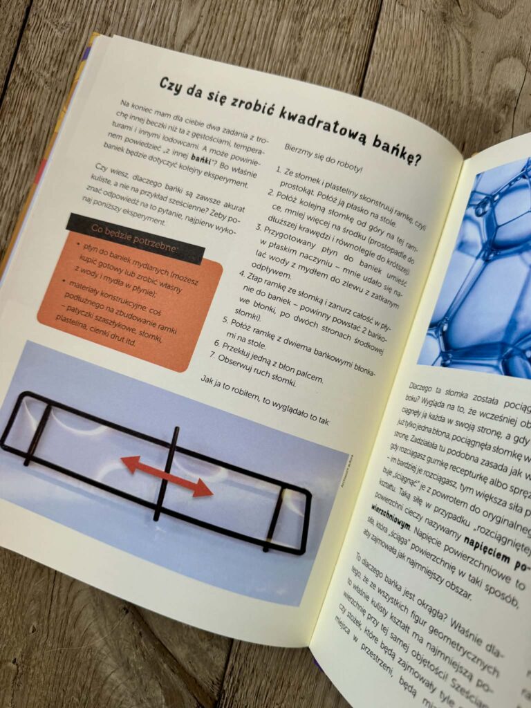 Eksperymentów jest naprawdę sporo, a wszystkie są opisane i poprowadzone szczegółowo, ale też przystępnie. Będziemy więc mierzyć gęstość przypadkowej cegły, sprawdzimy, czy woda może utonąć, zaobserwujemy, co szybciej rozpuszcza się w wodzie: cukier czy sól. Będziemy karmić drożdże, sprawdzać, jak długo stygnie woda i ile czasu trzeba gotować jajko na miękko. I najważniejsze: czy można zrobić kwadratową bańkę?