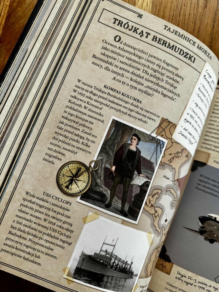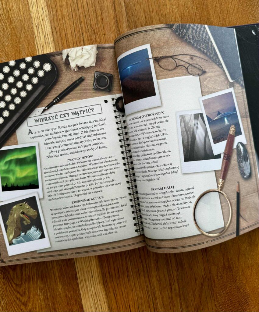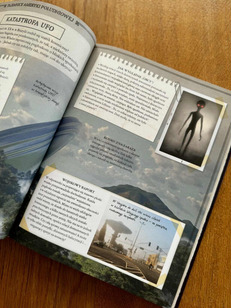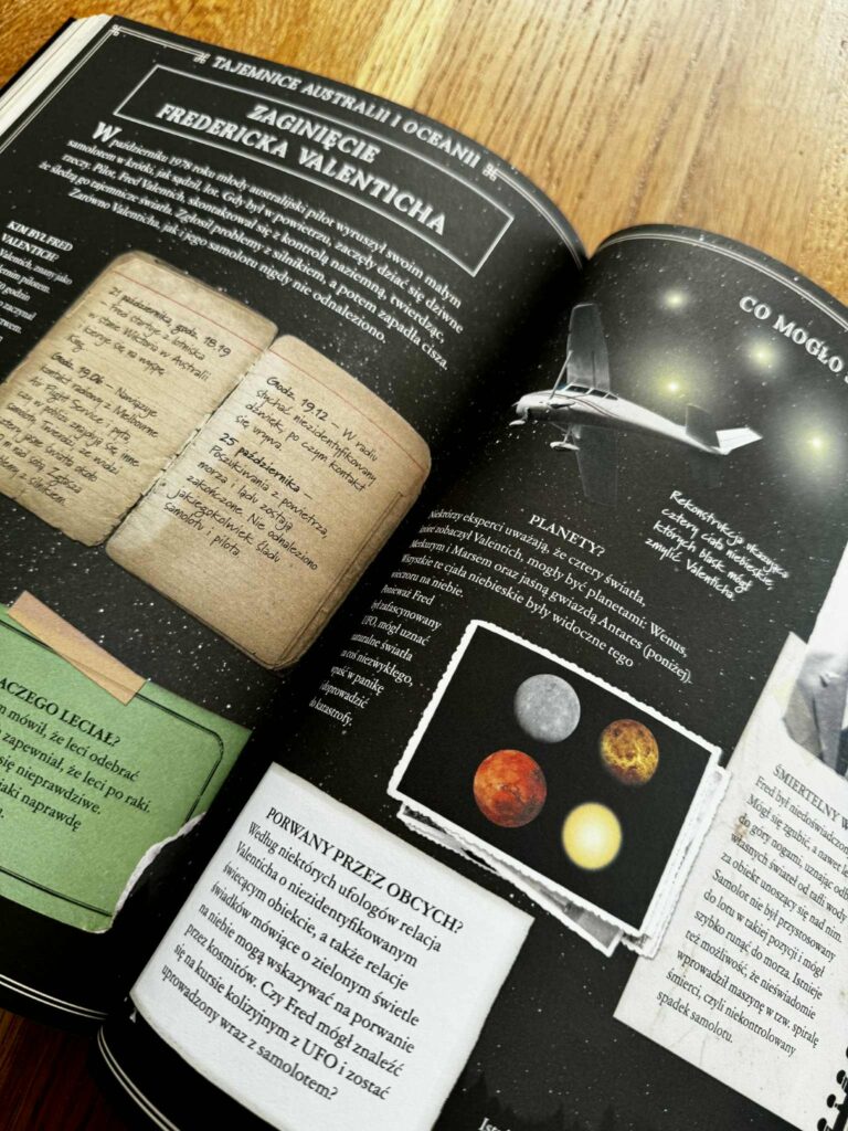 Czytając tę książkę z moją córką, co chwilę słyszałam: „Mamo, zobacz! A o co tu dokładnie chodzi?” – i przysięgam, że nie ma szans, że nie wkręcisz się w te historie. Książka jest przepięknie wydana: pełna kolorowych zdjęć, ilustracji, urywków z gazet, ciekawostek i krótkich, dynamicznych tekstów. Można ją czytać po kolei, można otwierać na chybił trafił i poznawać po jednej tajemnicy dziennie. To idealna propozycja do wspólnego, rodzinnego czytania, rozmów i dociekań.